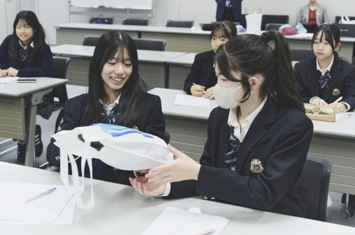 講座内ではリサイクルの事例として、化粧品容器から生まれたトートバッグが紹介されました。実際に生徒たちがバッグを手に取ると、「これが本当に容器からできているの?」「全然違う素材みたい!」と驚きの声が挙がりました。