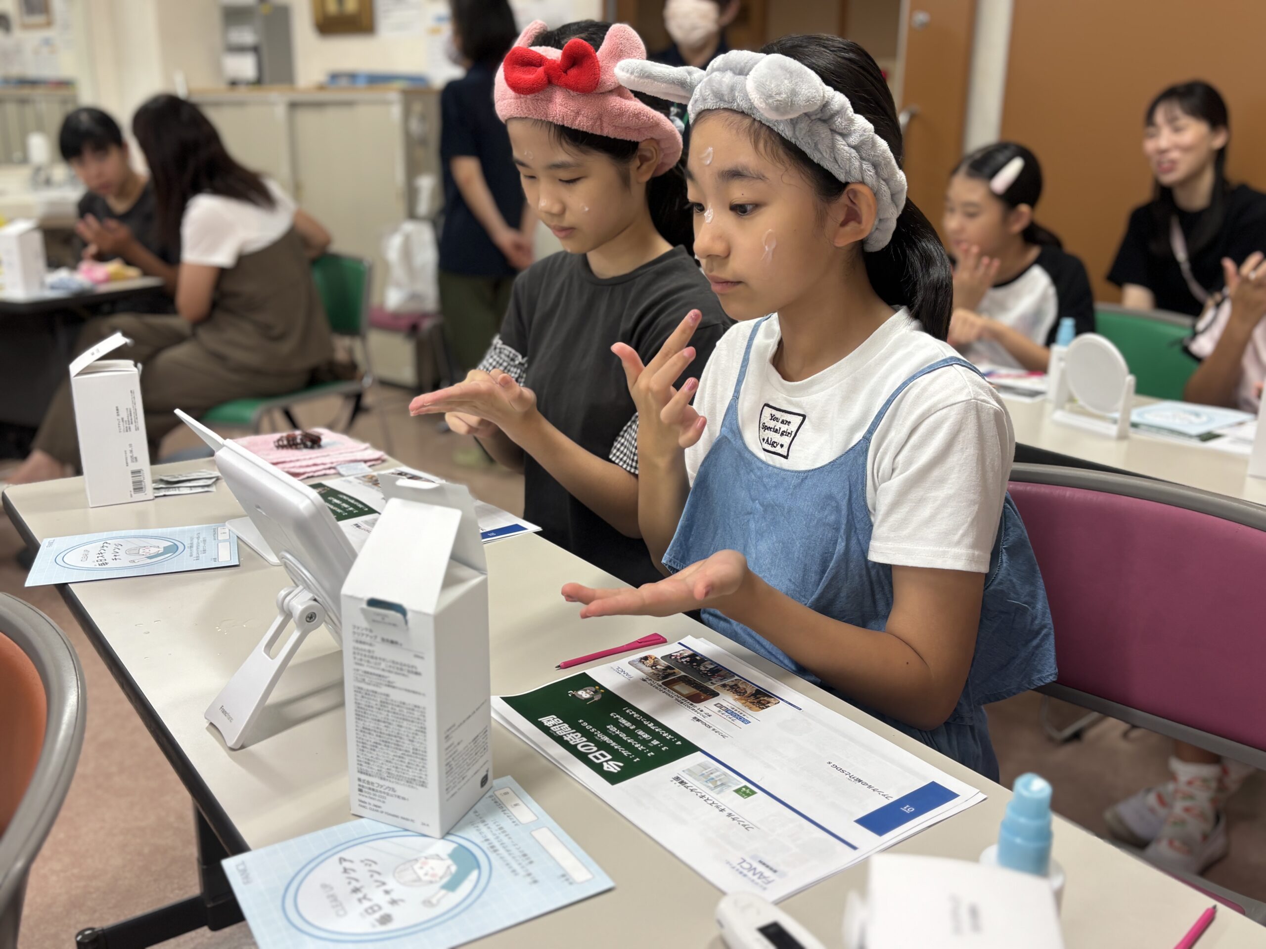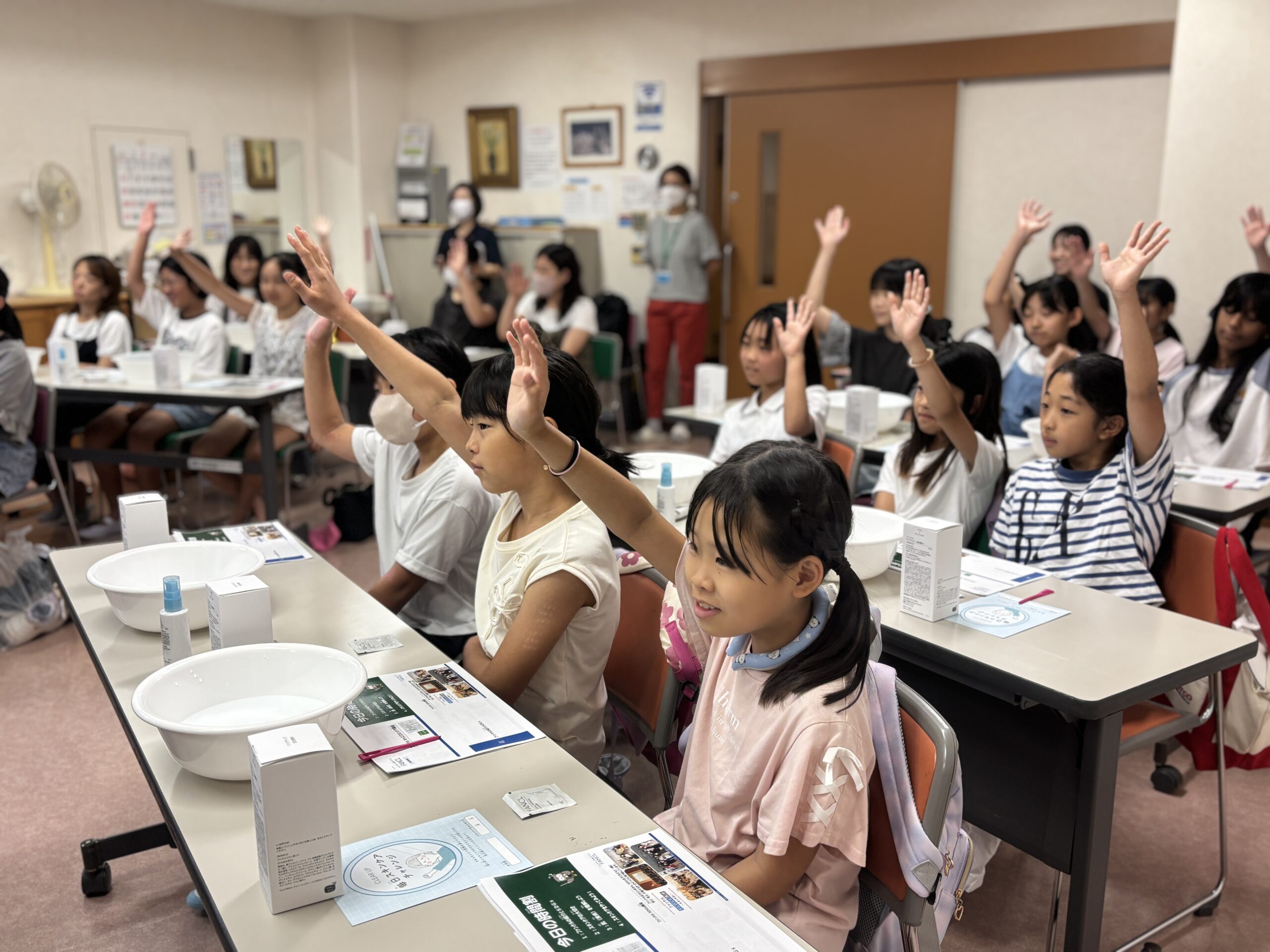 講座では、肌の仕組みや正しいスキンケアについてクイズを交えて楽しく学び、ファンケルの小学生のためのスキンケア商品を使った洗顔とスキンケアの体験を行いました。