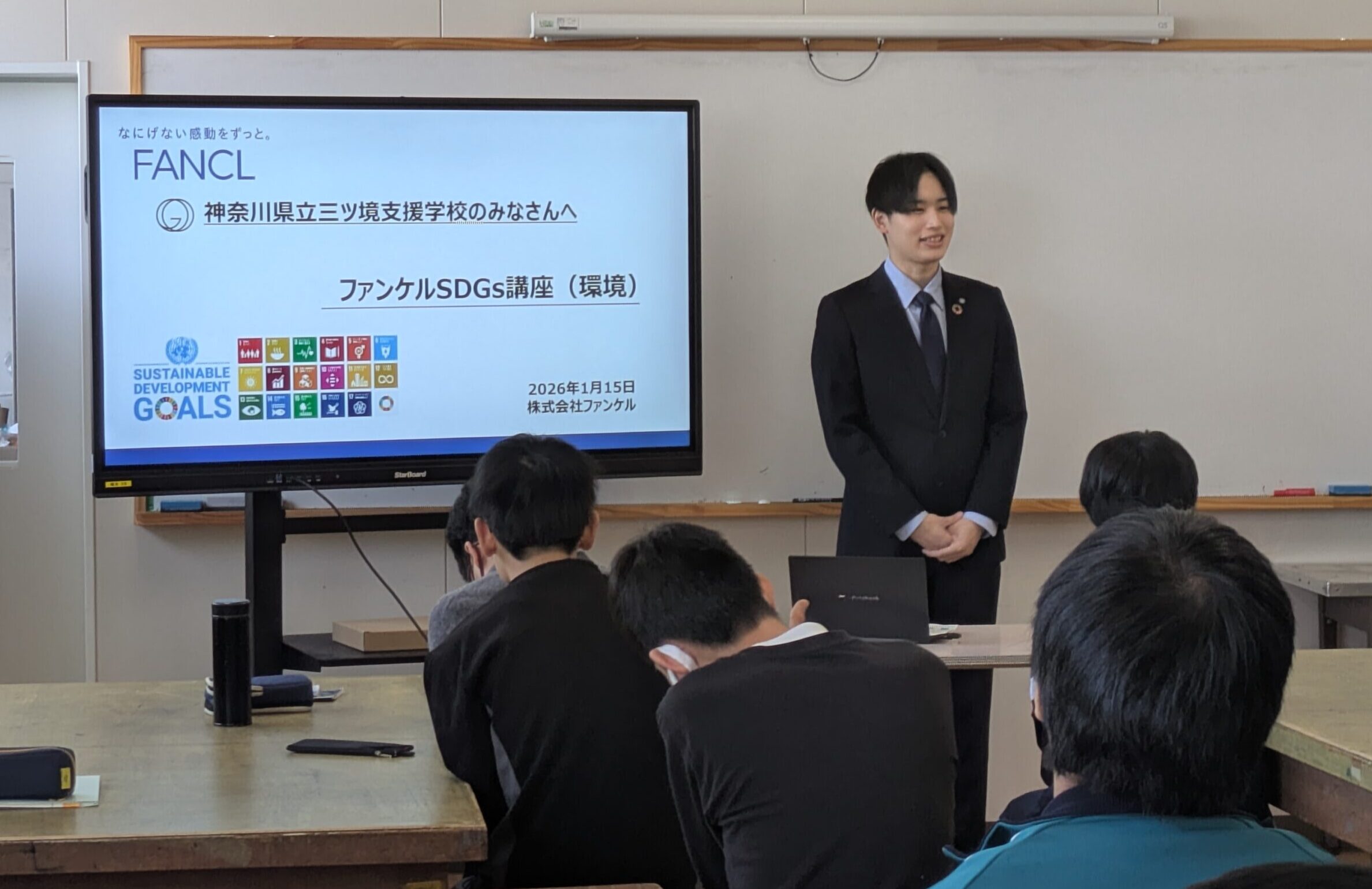 本校では、高等部2年生がSDGsの学習に取り組んでいます。ファンケルの取り組みを知り、生徒たちはプラスチックごみをどのように減らせるかについて関心を深めた様子でした。ディスカッションでは「ごみをしっかり分別する」といった意見が出たり、再生可能な素材へ変更する‟Renewable”への取り組みの話の際に「このスプーンを見たことがある!」と声が挙がったり、問題を自分ごととして考え、意欲的に学ぼうとする姿が見られました。講座を通して、一人ひとりが「自分に何ができるか」「日常生活の中でできることは何だろう」と考えたことは、今後の生活につながる大きな学びになりました。今後も生徒と一緒にできることから取り組んでいこうと思います。