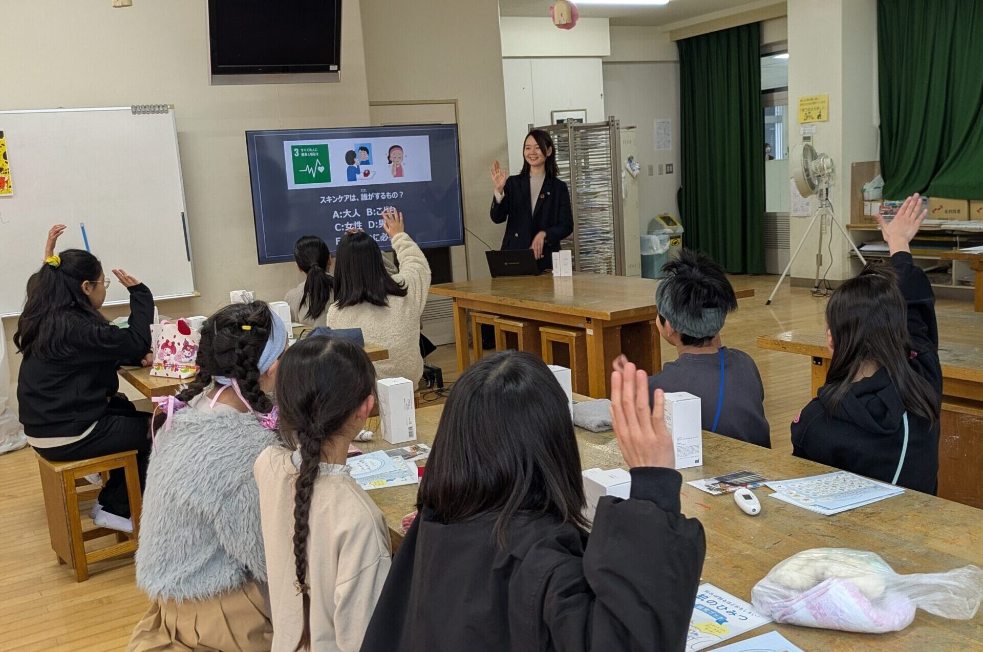肌の仕組みや正しいスキンケアの方法について、クイズや体験を交えながら楽しく学ぶことができました。子どもたちから「理想の自分になれた」「スキンケアに興味が湧いてきた」といった声も聞くことができ、とても楽しんでいる様子がうかがえました。今後もこのような学びにつながる活動を大切にしていきたいと思います。